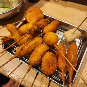 쿠시카츠는 돼지고기, 소고기, 해산물 등을 팬케이크 반죽에 싸서 빵가루를 입힌 후 기름에 튀겨낸 음식으로, 어묵을 튀겨서 먹는다고 생각하시면 됩니다. 술안주로 찾는 사람들이 점점 더 많아진다고 합니다.
